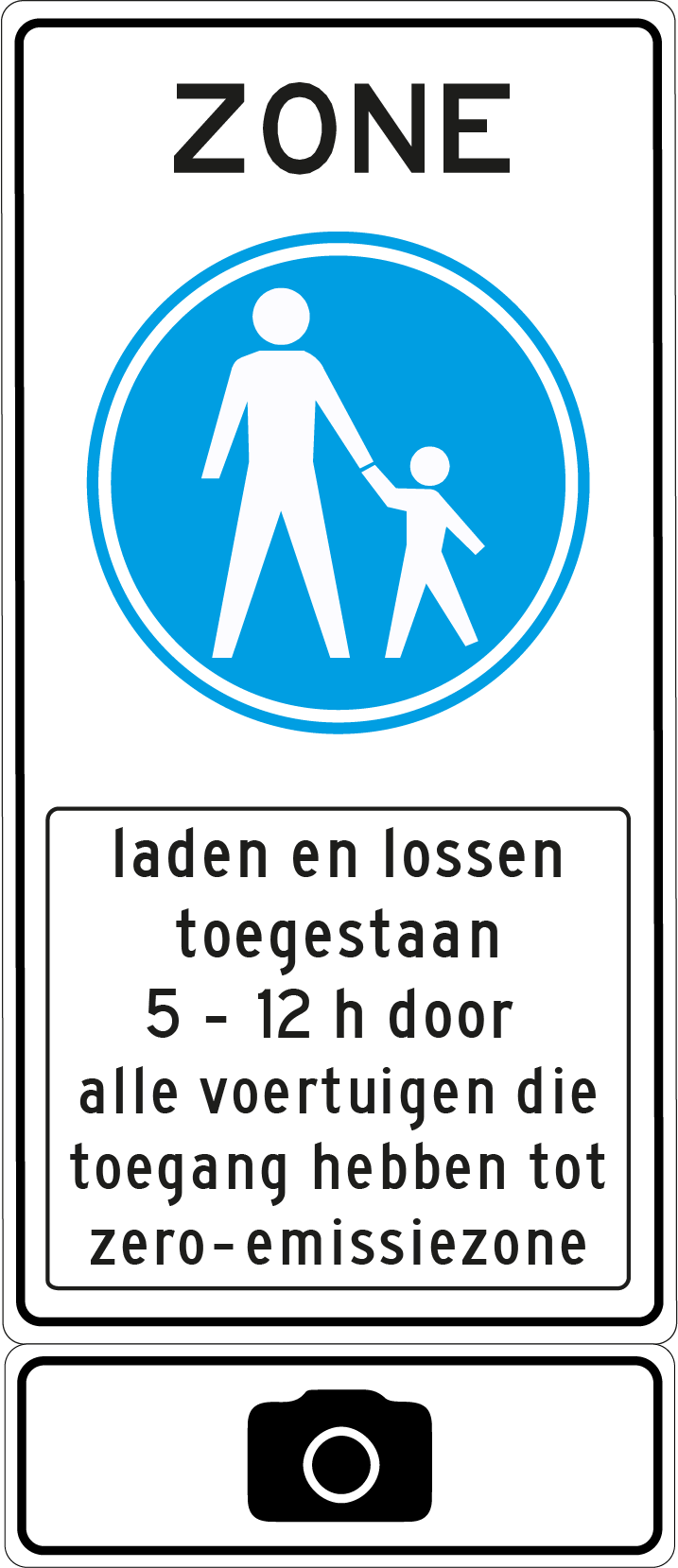 Daar waar een voetgangersgebied de entree vormt van de zero-emissiezone is bord G7 (voetgangersgebied) gebruikt met een onderbord met daarop “laden en lossen toegestaan 5 - 12 h door alle voertuigen die toegang hebben tot zero-emissiezone” en een onderbord met een camerasymbool. Hierdoor mogen alle gebruikers die de zero-emissiezone in mogen rijden (incl. ontheffinghouders, vrijgestelde voertuigen, voertuigen die in de overgangsregeling vallen maar ook toegestane voertuigcategorieën zoals personenauto’s) ook het voetgangersgebied in als zij gaan laden en lossen tussen 5 – 12 h.