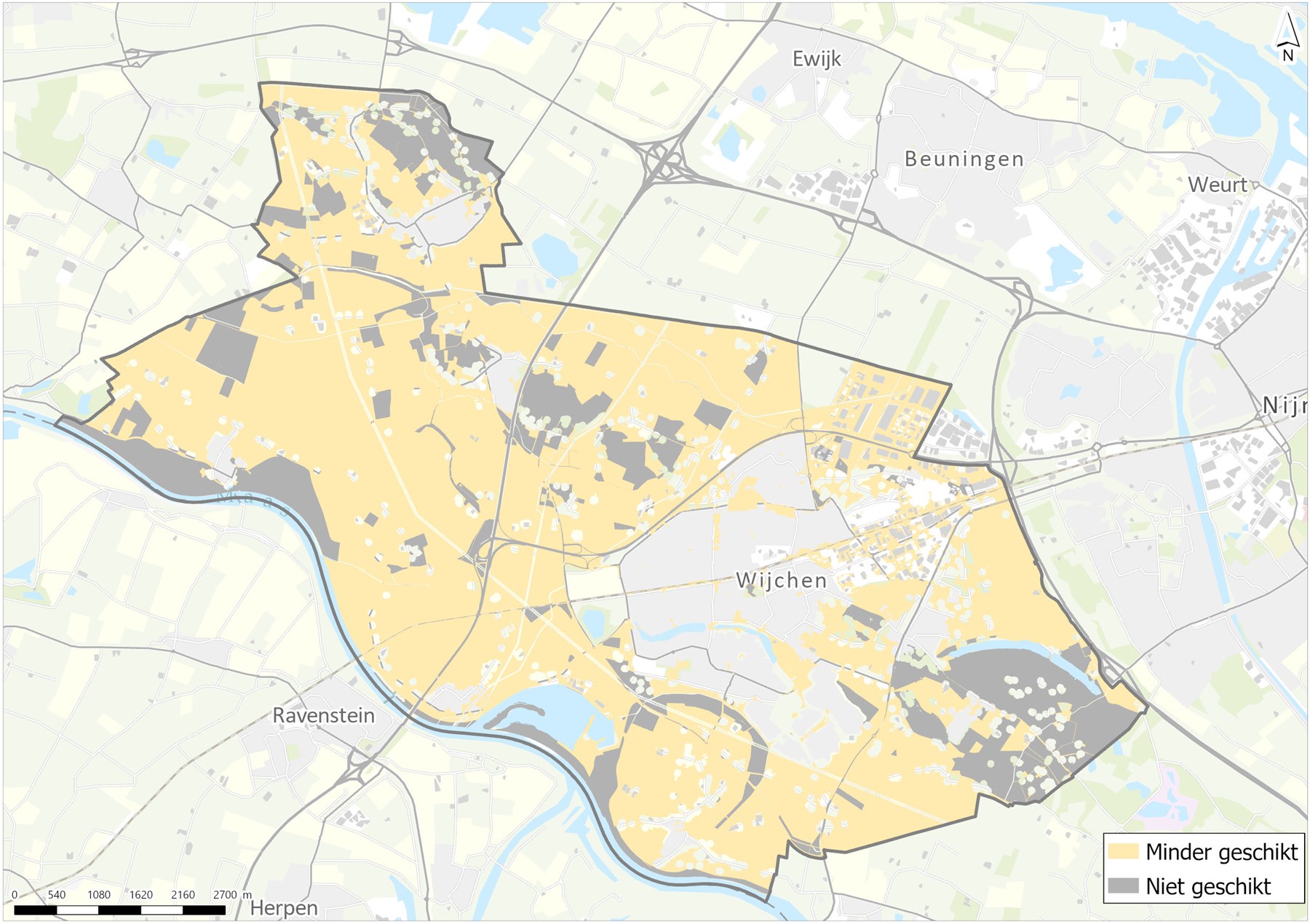 Afbeelding 4.3 Wijchense milieukaart voor windenergie (gebaseerd op een windmolen met ashoogte van 120 m en tiphoogte van 180 m)