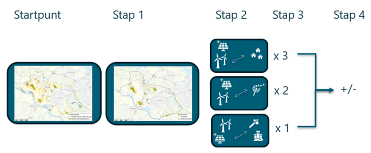 In stap 1 wordt de Wijchense milieukaart verdeeld in zoekgebieden die zich concentreren in en om de groene vlekken (‘geschikt’). Paragraaf 5.2 gaat hier verder op in. De zoekgebieden zijn de kansrijke gebieden waar de MCA zich op richt. Ook gele gebieden (‘minder geschikt’) rondom de groene vlekken worden meegenomen. Door deze gebieden ook mee te nemen kan later een betere afweging gemaakt worden voor precieze locaties van wind- of zonne-energie. Dit kan echter alleen als de gebieden door maatregelen geschikt gemaakt worden. In het plaatje bij stap 1 (zie afbeelding 5.1) is deze stap indicatief weergegeven. De grijze gebieden (‘niet geschikt’) en gebieden die niet op de kaart zijn ingekleurd, worden niet onderzocht. In paragraaf 5.2 wordt op deze stap ingegaan.