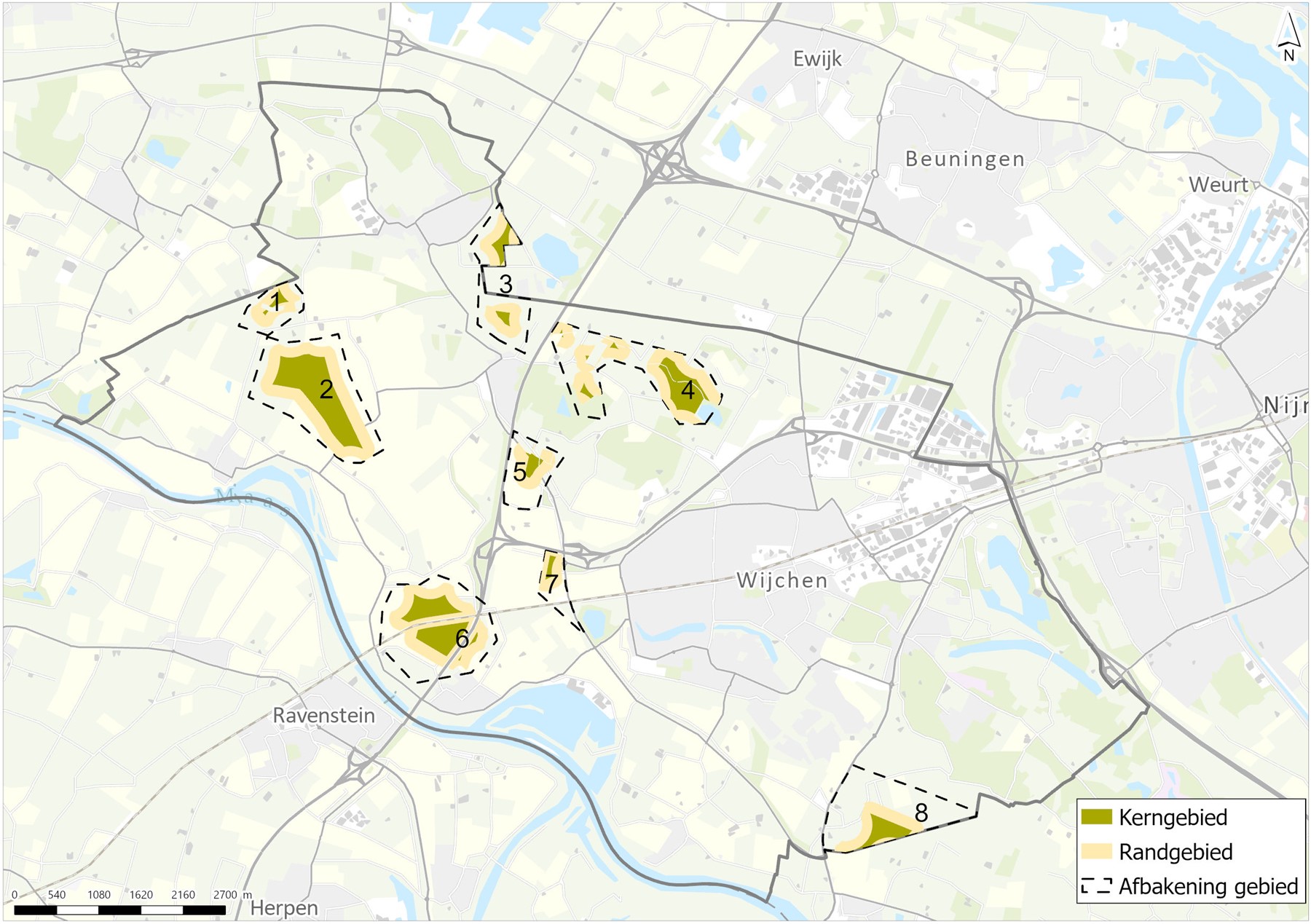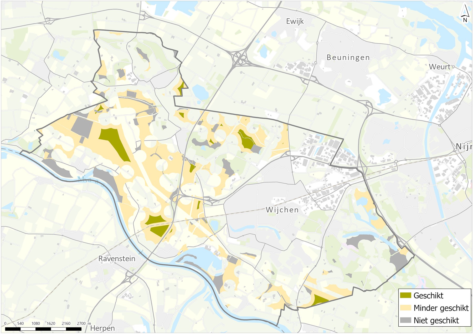 De gebieden die onderzocht zijn in de MCA zijn de groene vlekken (‘geschikt’) op de Wijchense milieukaart. Deze vlekken zijn soms klein en liggen geïsoleerd. Daarom zijn ze gebundeld in gebieden die een windpark of zonneveld kunnen vormen. Dit is gedaan met richtlijnen, om een navolgbare indeling te maken van gebieden.