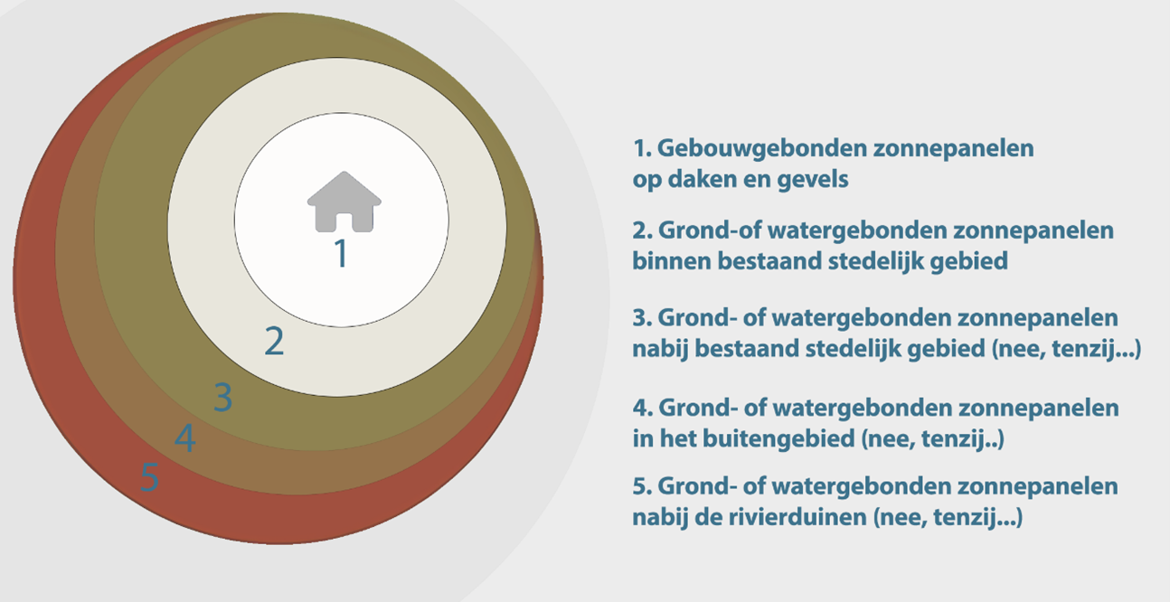 De afspraak is gemaakt om trede 1 t/m 3 van de zonne-ladder te stimuleren en zo slim mogelijk te combineren met ruimtelijke en maatschappelijke opgaven. Het nakomen van de RES-afspraken blijft daarbij het uitgangspunt. Er zijn uitzonderingen mogelijk voor zonne-energie op landbouwgrond (trede 4): a) de slimme combinatie van een zonnepark met een agrarische functie (agri-PV), b) gronden in transitie of die minder geschikt zijn voor landbouwgrond, en c) als het een oplossing biedt voor netcongestie dan wel bijdraagt aan efficiënter gebruik van het elektriciteitsnetwerk. Provincie Gelderland werkt aan het vastleggen van deze regels in haar Omgevingsverordening.
