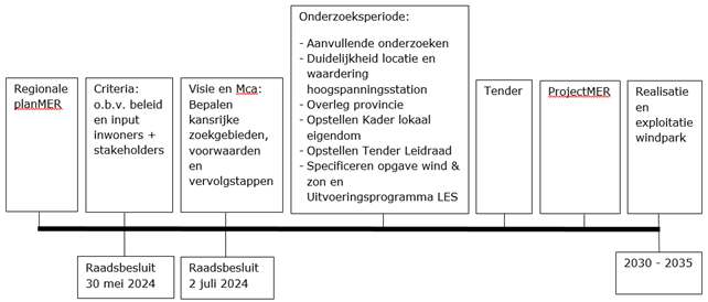 Gezien de lange looptijd van de ontwikkeling van wind- en zonneparken is het van belang het proces na vaststelling van de visie te starten. Realisatie van het beoogde opwekinitiatief vindt plaats in de periode 2030-2035.