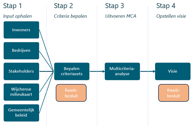 Bij het opstellen van de Visie op wind- en zonne-energie gemeente Wijchen: Op weg naar 2035 komen veel belangen kijken. Het is op de meeste plekken niet mogelijk om geen effecten te veroorzaken. Daarom is een afweging nodig tussen de verschillende belangen en effecten. Een multicriteria-analyse (MCA) is een manier om objectief gebieden te onderzoeken en te wegen aan de hand van verschillende criteria. De uitkomst is een gewogen beoordeling van verschillende zoekgebieden voor wind- en zonne-energie. In paragraaf 5.1 wordt globaal uitgelegd welke stappen doorlopen zijn voor de MCA. In paragrafen 5.2 tot en met 5.4 zijn deze stappen verder uitgewerkt.
