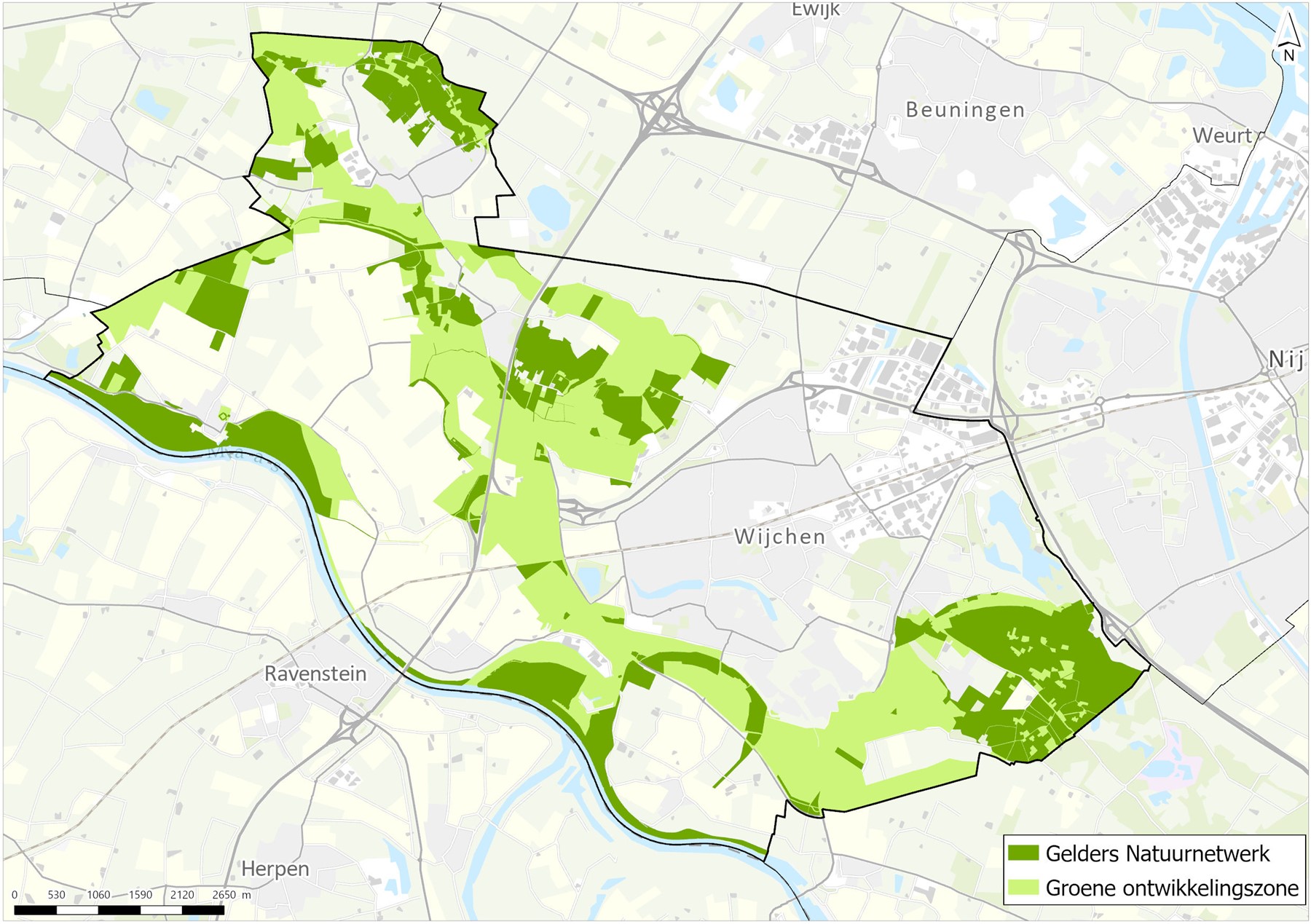 In het regionale plan-MER zijn niet alle gebieden van het Gelders Natuurnetwerk uitgesloten voor de opwek van duurzame energie. Voor een deel van het Gelders Natuurnetwerk heeft de provincie in haar omgevingsbeleid namelijk opgenomen dat hier geen windmolens kunnen komen, behalve onder strikte voorwaarden (minder geschikt). Voor sommige gebieden in het netwerk laat de provincie ruimte, omdat de natuurkwaliteit in die gebieden niet zo goed is en omdat ze in provinciale voorkeursgebieden voor duurzame energie liggen, zoals bijvoorbeeld langs snelwegen (geschikt). In de raadpleging is door bewoners en ambtenaren genoemd dat duurzame energie in Gelders Natuurnetwerk in Wijchen niet wenselijk is (zie paragraaf 2.3 en 3.1). Dit komt omdat er weinig natuurnetwerk is, en de kwaliteit verslechtert. Daarom is het belangrijk om het Gelders Natuurnetwerk te beschermen en wordt wind- en zonne-energie in het hier uitgesloten (niet geschikt, zie afbeelding 4.1). De Groene ontwikkelingszone wordt niet bij voorbaat uitgesloten.