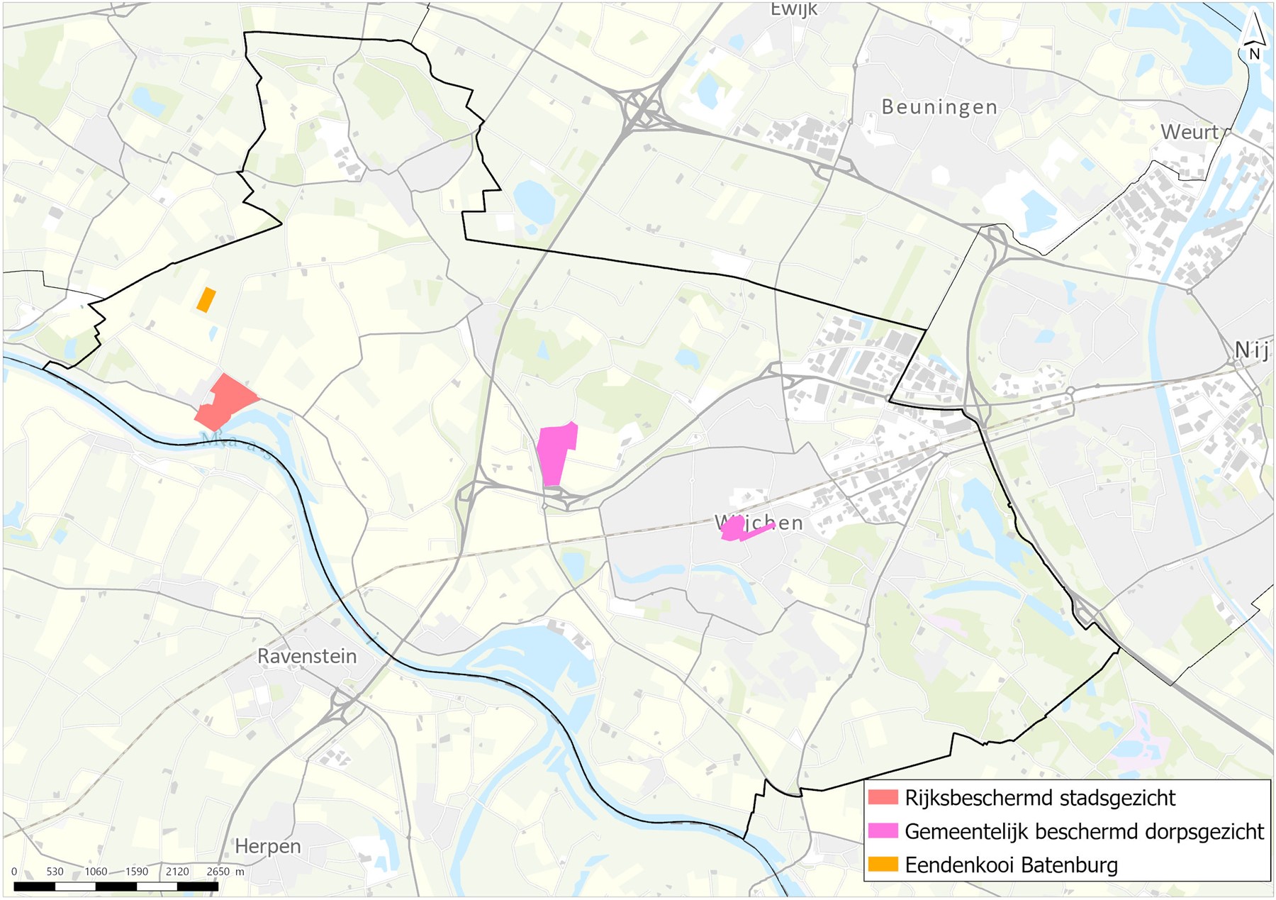 Tijdens de bewonersavonden is aangegeven dat de Rijksdienst voor Cultureel Erfgoed (RCE) een richtafstand van 1,8 km aanhoudt tot beschermde dorps- en stadsgezichten Wijchen, Leur en Batenburg (zie afbeelding 4.2). Het RCE adviseert om binnen dit gebied nader onderzoek uit te voeren naar effecten van windenergie op de cultuurhistorische waarde van een beschermd stads- of dorpsgezicht. Daarnaast is in gemeente Wijchen het Parapluplan Cultuurhistorie van kracht. In dit parapluplan is geïnventariseerd welke cultuurhistorische waarden in de gemeente beschermt moeten worden. Voor ruimtelijke ontwikkelingen in het gebied waar het parapluplan geldt moet onderzoek plaatsvinden naar de effecten van duurzame energie op cultuurhistorische waarden. Deze twee aspecten zijn voor een regionale afweging niet in beeld gebracht, en worden daarom toegevoegd op de Wijchense kaart. De zone van 1,8 km rondom de beschermde dorps- en stadsgezichten krijgt de beoordeling ‘geschikt’, omdat met landschappelijke inpassing rekening gehouden kan worden met zichtlijnen en cultuurhistorische waarden. Bij concrete projecten dient dit onderzocht te worden.