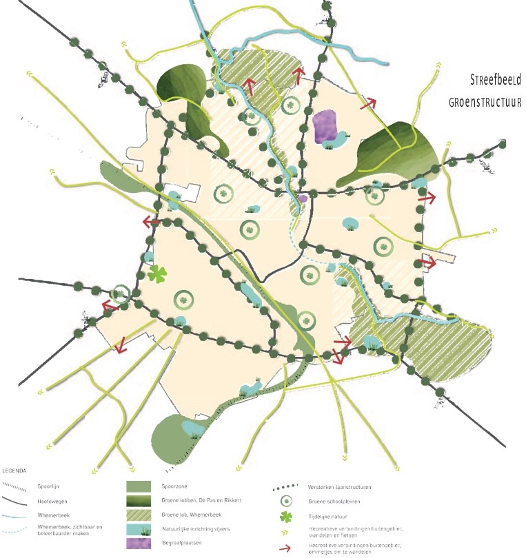 Niet alleen het buitengebied is belangrijk voor de natuur. Ook in de kern streven we naar een natuurnetwerk. Groene lobben en vingers vanuit het buitengebied het dorp in, zoals rond het station, spoorzone, radialen en de Whemerbeek, zijn van belang voor het woongenot van de dorpsbewoners. Deze vormen ecologische verbindingen waarlangs flora en fauna zich kunnen verplaatsen. Ze bestaan bij voorkeur uit een combinatie van extensief beheerde grasweiden, plantsoen en opgaande beplantingen met inheemse houtsoorten, met daartussen een zoom van hoger opgroeiende ruigtekruiden. Voor de Whemerbeek liggen er kansen om oude kavelstructuren weer zichtbaar te maken.