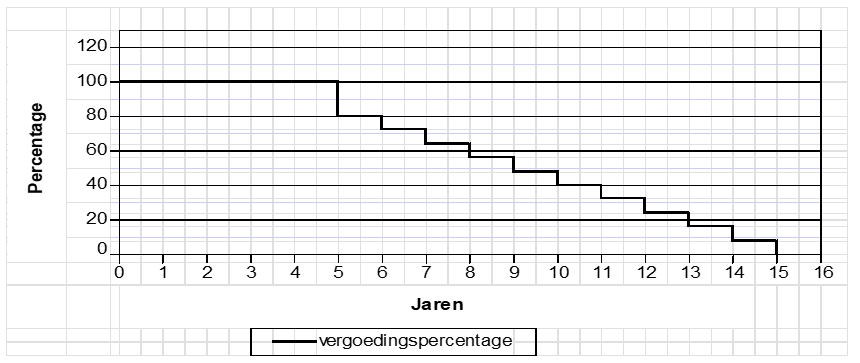 Indien de netbeheerder een aanschrijving krijgt tot het verleggen van een leiding in de periode gelegen vanaf vijf tot en met vijftien jaren, gerekend vanaf de datum van de inwerkingtreding van de betrokken vergunning, zal de gemeente 80% van het schadebedrag vanaf het 6e jaar tot 0% vanaf het 16e jaar (trapsgewijs) als nadeelcompensatie uitkeren volgens het schema weergegeven in bijlage 2.