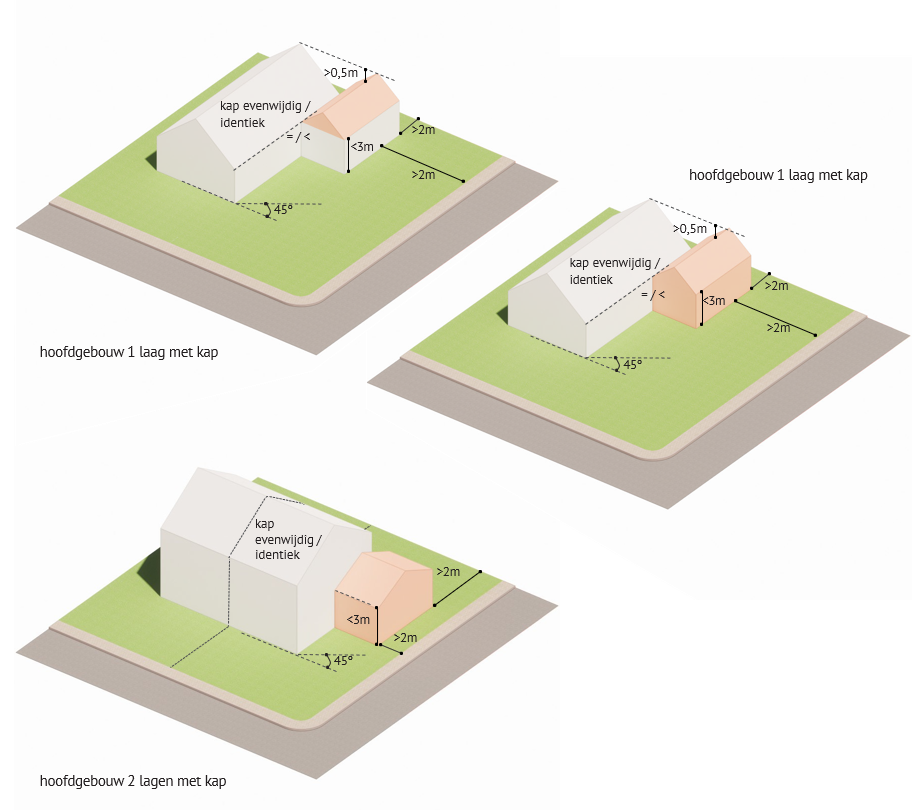 Belangrijk is dat de contouren en het silhouet van het oorspronkelijke gebouw of bouwblok zichtbaar blijven en dat het bijbehordende bouwwerk qua uitstraling en volume ondergeschikt is aan het oorspronkelijke gebouw.
