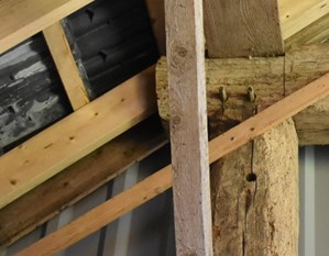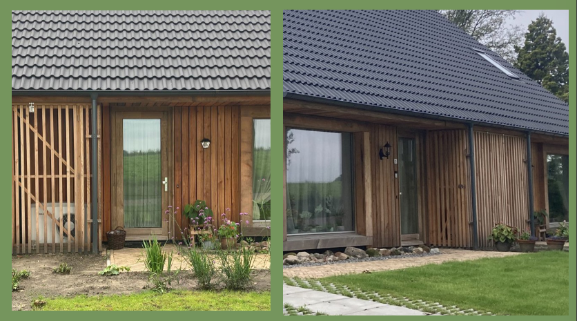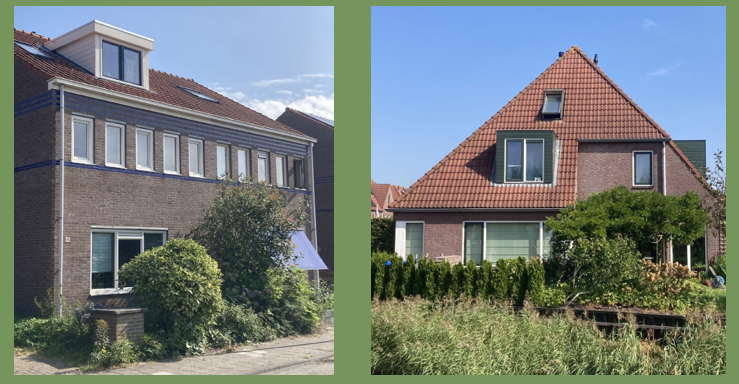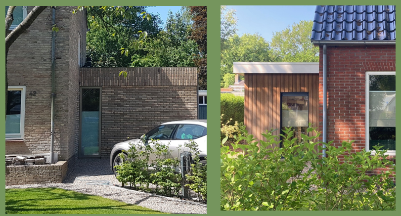 onder rechts: Duidelijk zichtbare nieuwe toevoeging middels een houten gevel en een witte dakrand met overstek.