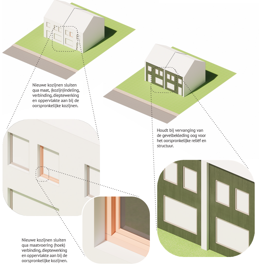 De vormgeving van gevels en kozijnen vormen immers de meest kenmerkende eigenschappen van bebouwing. Wijzigingen dienen zorgvuldig te worden ontworpen, met oog voor de vormgeving van profilering en detaillering van kozijnen, de gevelcompositie, -indeling en -geleding, en het straatbeeld als geheel.