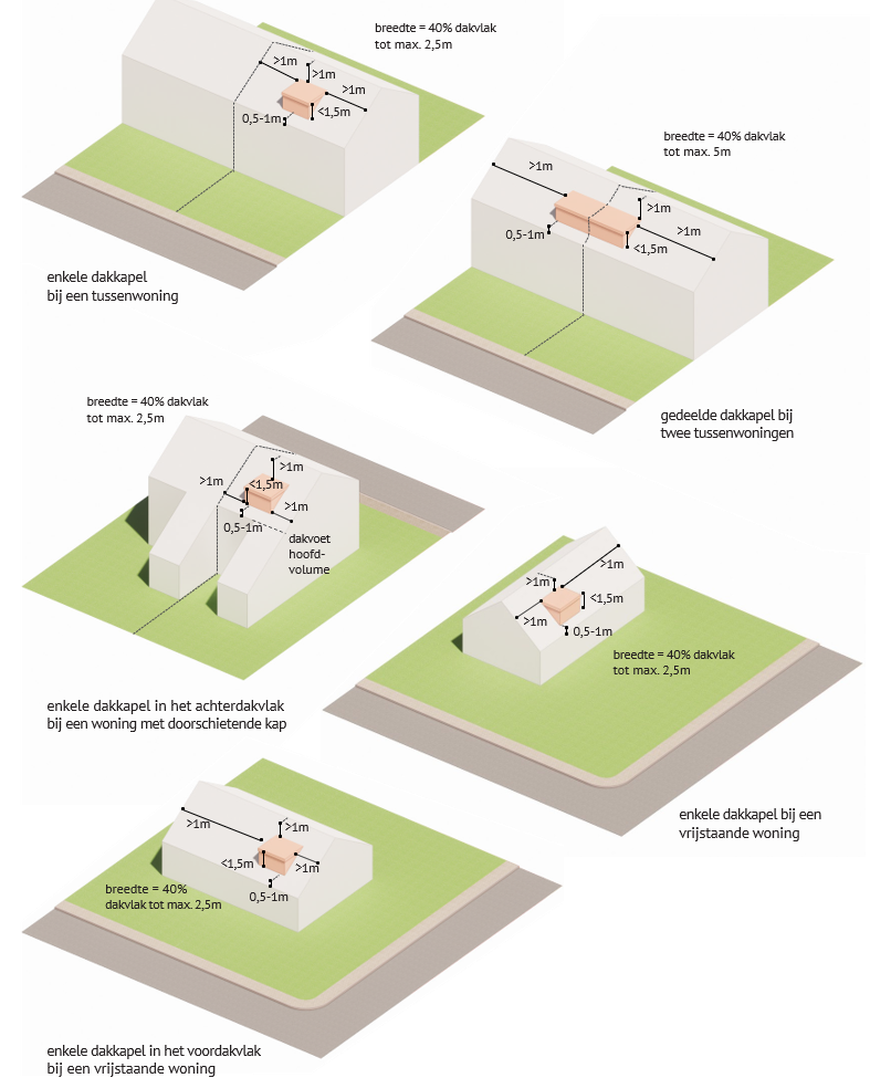 Dakkapellen moeten een ondergeschikte toevoeging zijn aan een dakvlak. Het plaatsen van een dakkapel mag dus niet ten koste gaan van de karakteristiek van de kapvorm. Daarom mag een dakkapel nooit domineren in het silhouet van het dak en moet de noklijn van het dak, afhankelijk van straatprofiel, vanaf de weg zichtbaar blijven. Bovendien moet de ruimte tussen dakkapel en goot voldoende zijn.