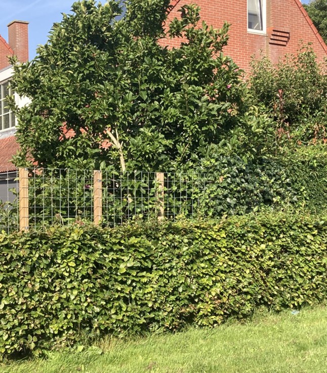 Deze afscheiding van een zijdelingse perceelgrens bestaat uit een lage beukenhaag met daarachter rasterwerk dat verder gaat begroeien met hedera. Deze groene afscheiding zorgt voor veiligheid, privacy en een groene uitstraling van de wijk.
