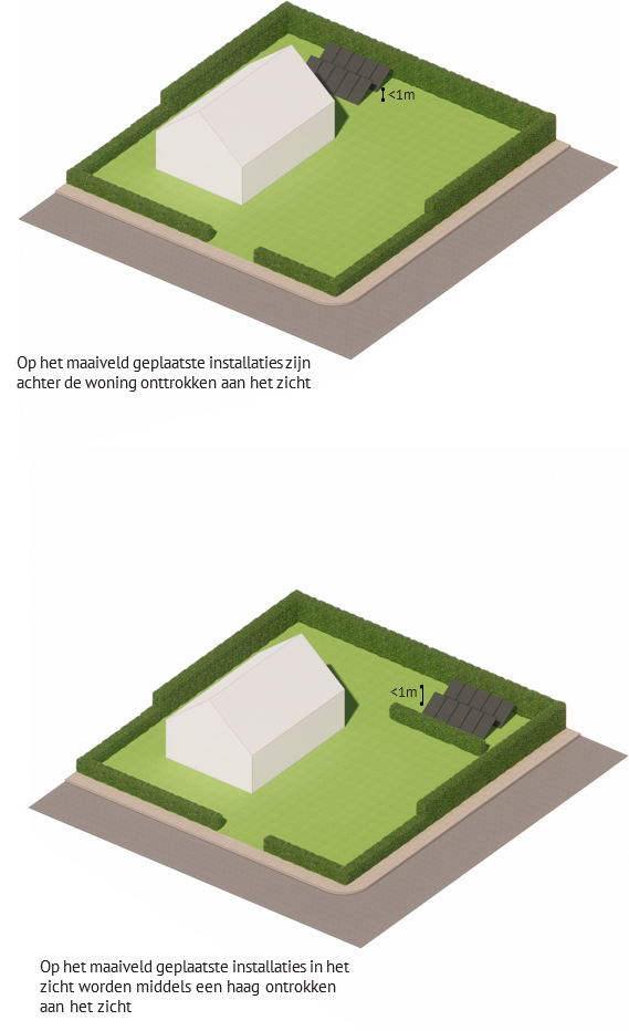 Door zonnepanelen een plek achter borders en fruitbomen te geven vallen deze minder op vanuit de openbare ruimte. Voor sommige locaties kan een verdiepte plaatsing in combinatie met streekeigen hagen een passende oplossing zijn.