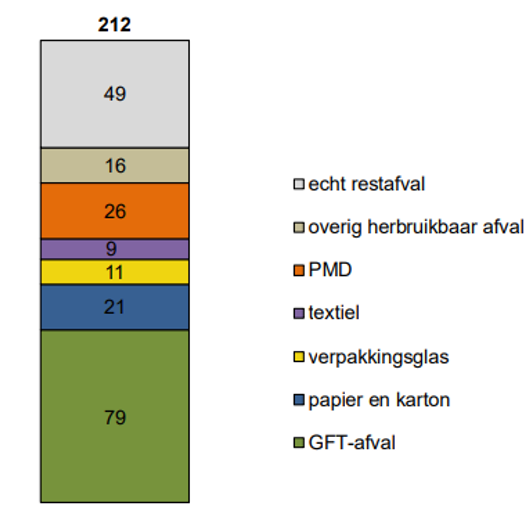 In afbeelding 5 is 212 kilogram restafval per inwoner weergeven. Dit betreft het huis aan huis ingezamelde fijn restafval. Grof restafval (28 kilogram per inwoner in 2019) en op de milieustraat ingezameld fijn restafval (17 kilogram per inwoner in 2019) zijn niet in de analyse meegenomen.
