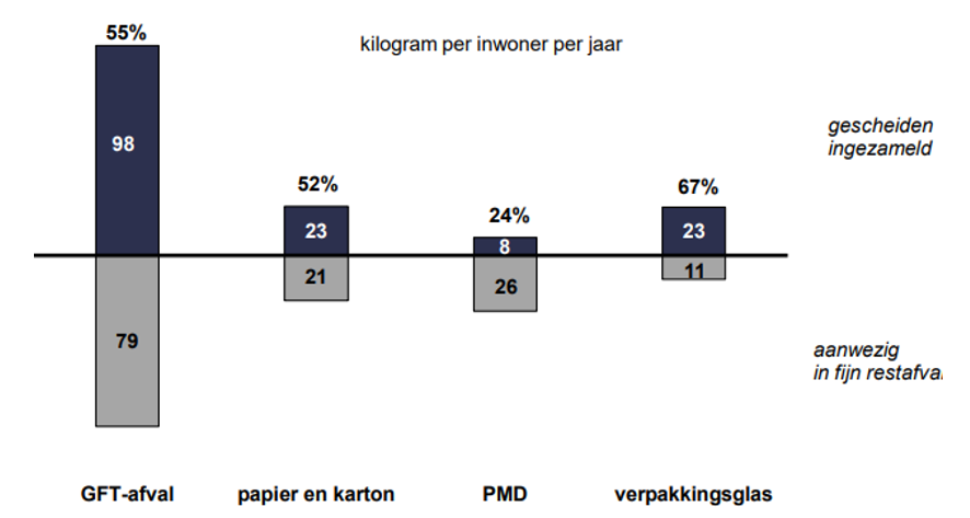 In 2019 was de hoeveelheid restafval (fijn en grof) 243 kilogram per inwoner. Dit is 143kg boven de VANG-doelstelling van 100 kilogram restafval per inwoner in 2020. Vergelijkbare gemeenten hebben gemiddeld ca. 163 kilogram restafval per inwoner.
