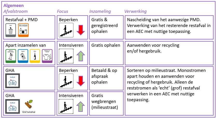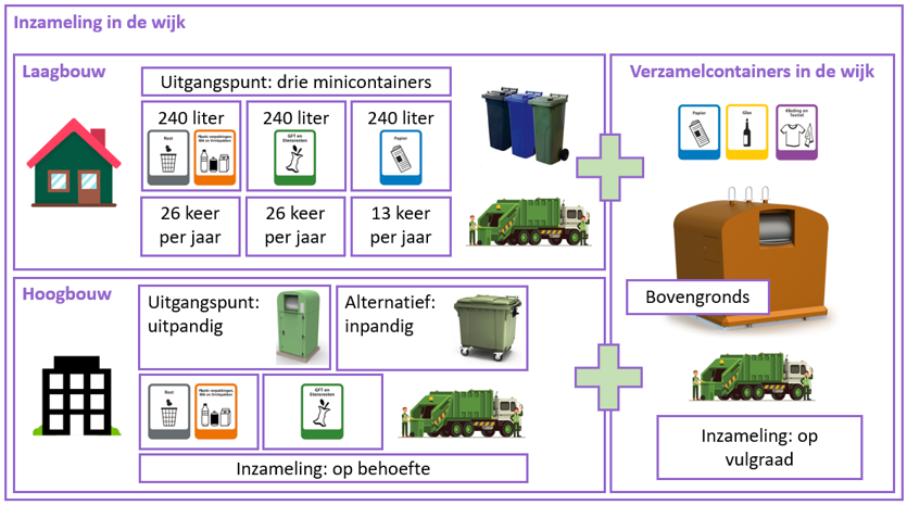 Aanvullend wordt onderscheid gemaakt in twee deelgebieden: (1) inzameling in de wijk (bij hoog- en laagbouw) en (2) inzameling op de milieustraat. Samenvattend is de aanpak voor inzameling in de wijk in afbeelding 2 weergegeven.