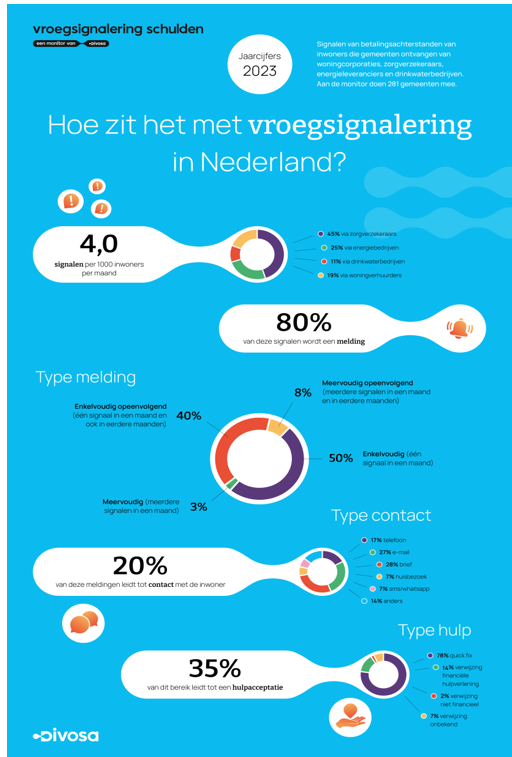Voorgaand overzicht is afkomstig van Divosa.nl. ‘Hoe zit het met de vroegsignalering in Nederland’? Gemeenten hebben vorig jaar fors meer huishoudens in beeld gekregen met een beginnende betalingsachterstand. Het aantal signalen dat gemeenten kregen van verhuurders, zorgverzekeraars, drinkwater- en energiebedrijven ging met een kwart omhoog naar ruim 700.000. Dat blijkt uit de jaarrapportage over 2023 van de Divosa Monitor Vroegsignalering Schulden14.