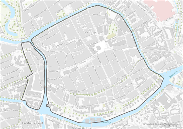 Als “binnenstad” als bedoeld in artikel 1 van deze verordening geldt het gebied binnen de omlijningen van onderstaande kaart.
