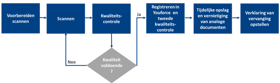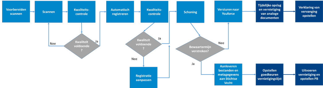 Als er een akkoord is op de vernietiging worden de scanbestanden vernietigd en wordt dit opgenomen op het proces-verbaal. De analoge documenten worden niet gescheiden van de documenten waarvan de scans wel naar Youforce gaan. In plaats daarvan worden ze allemaal tegelijkertijd vernietigd, als onderdeel van het vernietigen na vervanging.