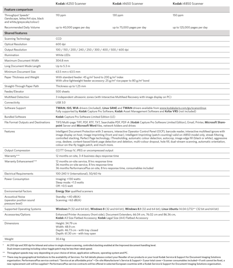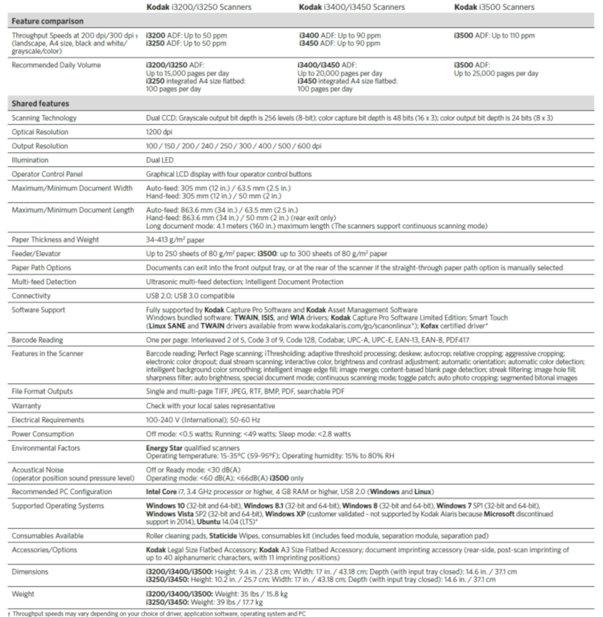Figuur 5 Specificaties Kodak i3250 scanner (Karmac)