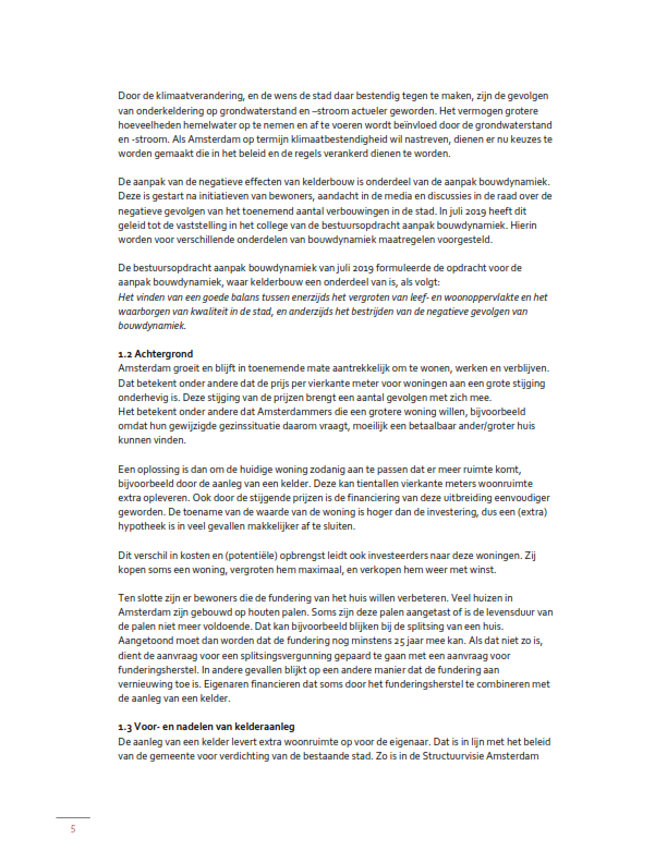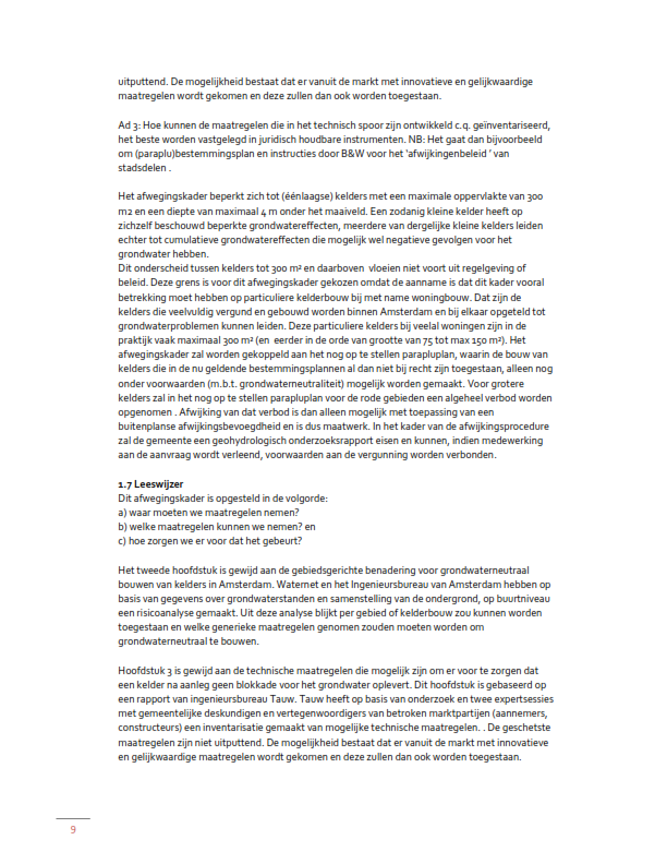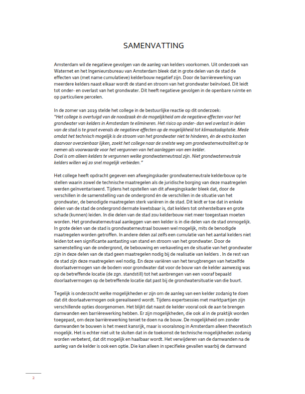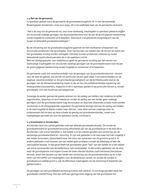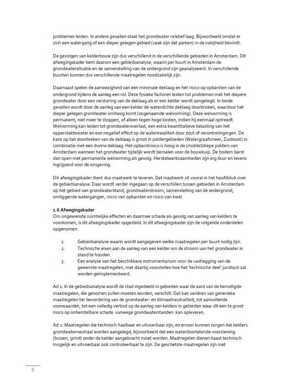 Teneinde ongewenste ruimtelijke effecten en daarmee schade als gevolg van aanleg van kelders te voorkomen, is het Afwegingskader Grondwaterneutrale kelders Amsterdam (hierna: Afwegingskader) opgesteld. Het Afwegingskader is door de gemeenteraad vastgesteld op 20 januari 2021 (Nr. VN2020-030011).