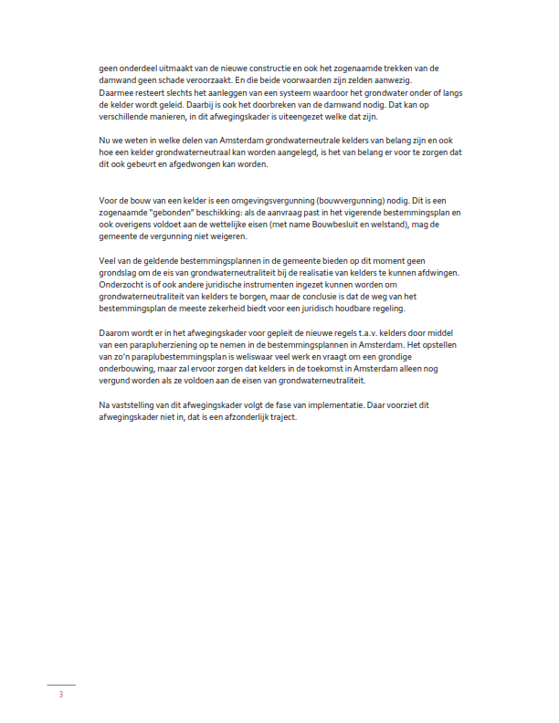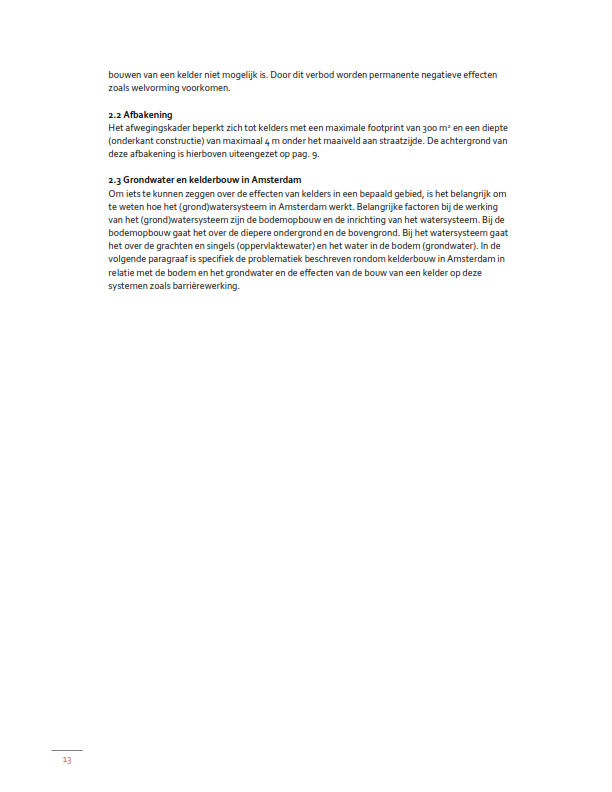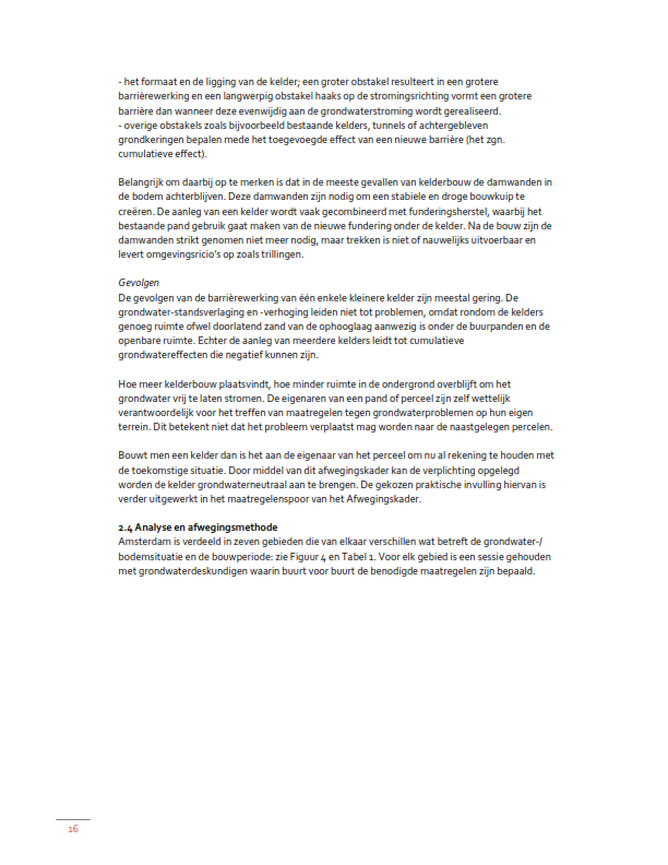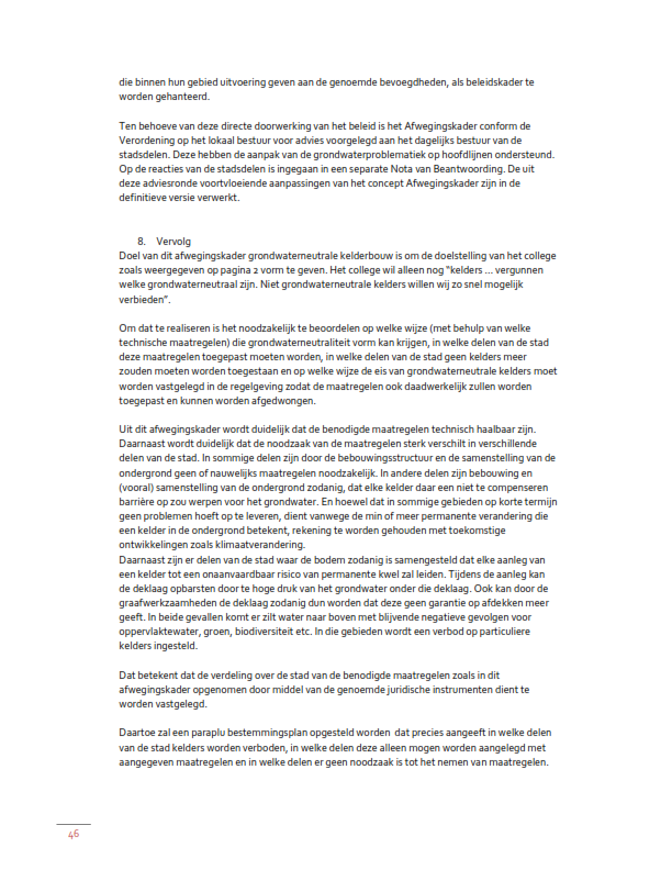 Van een grondwaterneutrale kelder is volgens het Afwegingskader sprake als door de aanleg van die kelder de stand en stroming van het grondwater niet of nauwelijks verandert, waar mogelijk zal verbeteren, en waarbij er geen negatieve grondwatereffecten optreden. Of dat het geval is, kan alleen per geval worden beoordeeld. Die beoordeling vindt plaats in het kader van een aanvraag om een omgevingsvergunning voor een omgevingsplan activiteit bouwwerken, bedoeld in art. 4.7 van de hoofdregeling Omgevingsplan gemeente Amsterdam.
