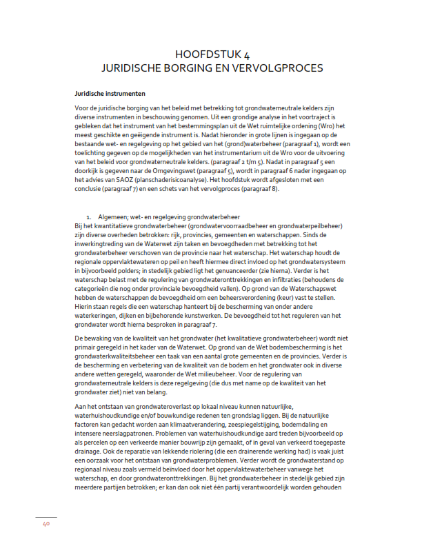 De regeling in het omgevingsplan dient ter vervanging van het bestemmingsplan Grondwaterneutrale Kelders en bestemmingsplannen van later datum waarin een soortgelijke regeling is opgenomen. Er is geen sprake van inhoudelijke aanpassing. De vorm is wel iets anders. Daar waar in de onder oud recht vastgestelde bestemmingsplannen werd voorzien in een verbod met afwijkmogelijkheid, wordt in subparagraaf 4.2.4.8 voorzien in een beoordelingsregel die van toepassing is op aanvragen om een vergunning voor een omgevingsplanactiviteit bouwwerken. De beoordelingsregel houdt kort gezegd in dat die vergunning alleen kan worden verleend als de activiteit niet leidt tot onaanvaardbare grondwatereffecten op de omgeving. De inhoudelijke beoordeling blijft plaatsvinden aan de hand van de in deze beleidsregel opgenomen regels.