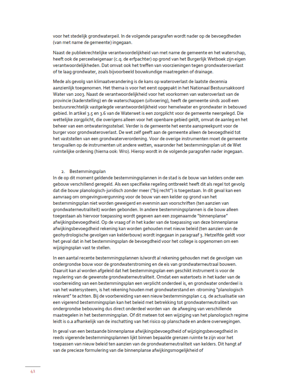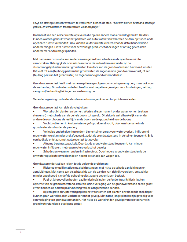 Voor de tweede categorie geldt dat niet wordt voorzien in inhoudelijke beleidsregels. Om vast te kunnen stellen of een ondergronds gebouw kan worden gebouwd, zal uit een geohydrologisch onderzoek moeten blijken dat de activiteit niet leidt tot onaanvaardbare grondwatereffecten op de omgeving. Hoewel de beleidsregel hier dus niet van toepassing is, kan deze uiteraard wel dienen als referentiekader voor het onderzoek.