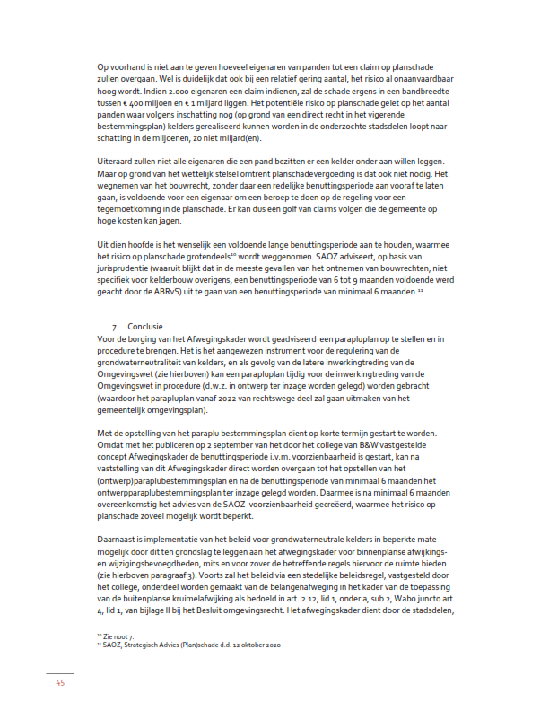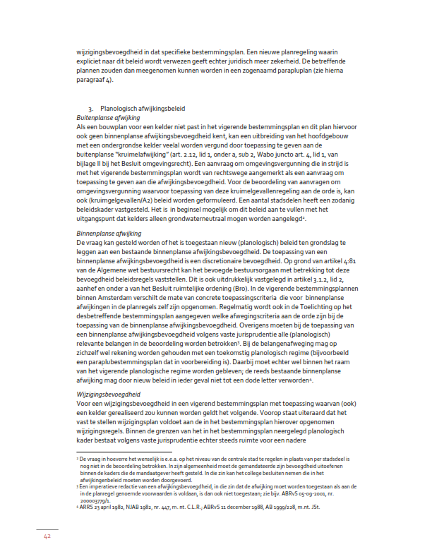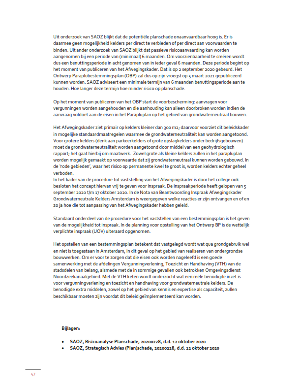Om het beleid uit het Afwegingskader juridisch te borgen heeft de gemeenteraad op 7 oktober 2021 het paraplubestemmingsplan Grondwaterneutrale kelders Amsterdam (hierna: het paraplubestemmingsplan) vastgesteld. De daarin opgenomen regeling houdt kort gezegd in dat er een algemeen verbod geldt op het realiseren van nieuwe kelders. Voor bepaalde gebieden geldt een afwijkmogelijkheid van dat verbod. Voor wat betreft de voorwaarden waaronder van het verbod kan worden afgeweken, is in het paraplubestemmingsplan gekozen voor een dynamische verwijzing naar een beleidsregel in de zin van art. 4:81 van de Algemene wet bestuursrecht. De relevante beleidsuitgangspunten uit het Afwegingskader zijn daarin (ongewijzigd) vastgesteld als.