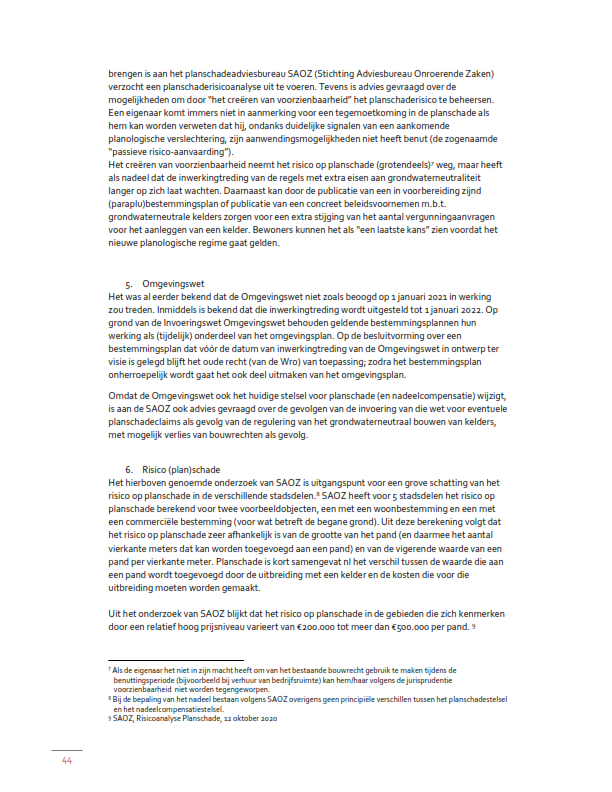 Inmiddels is de Omgevingswet in werking getreden, en geldt er een omgevingsplan. Bestemmingsplannen die onder oud recht zijn vastgesteld, maken van rechtswege onderdeel uit van dat omgevingsplan. Wel moeten ze worden vervangen door nieuwe regels. Dat geldt ook voor de regels die onaanvaardbare grondwatereffecten als gevolg van de bouw van nieuwe kelders moeten voorkomen. Daartoe is aan het omgevingsplan een beoordelingsregel toegevoegd die betrekking heeft op vergunningaanvragen voor een omgevingsplanactiviteit bouwwerken. De regeling is opgenomen in subparagraaf 4.2.4.8 van de hoofdregeling van het Omgevingsplan gemeente Amsterdam en moet in de plaats treden van die in afzonderlijke bestemmingsplannen opgenomen regelingen. Dat zal gebied voor gebied gebeuren.