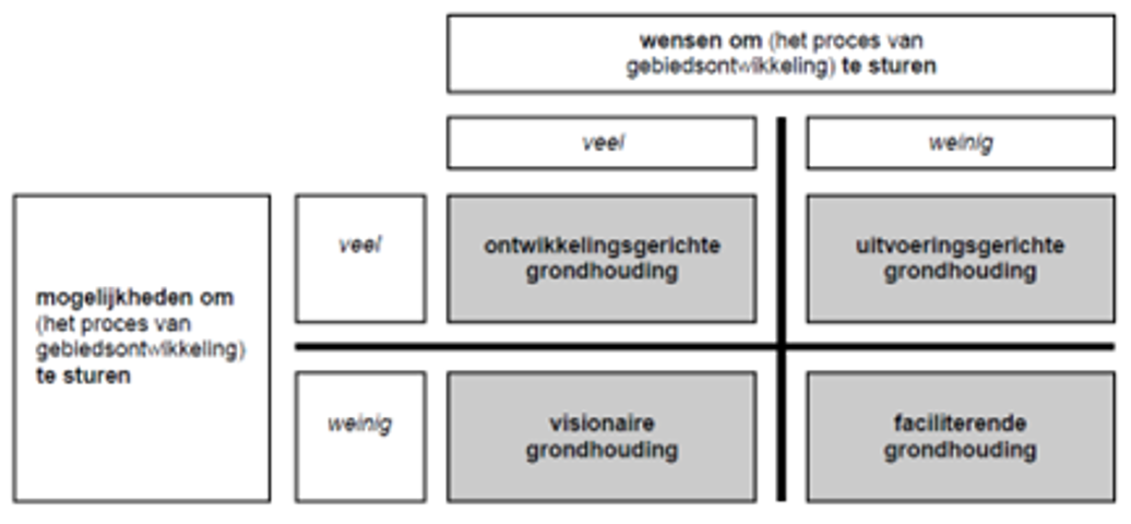 Bovengenoemde factoren zijn van invloed op de grondhouding van de gemeente in het realiseren van haar ruimtelijke ambities. De factoren worden ook genoemd in het Afwegingskader. Het Afwegingskader wordt nader beschreven in paragraaf 1.2.1. Er kan een ontwikkelingsgerichte/visionaire of uitvoeringsgerichte/faciliterende houding worden gekozen, dit heeft te maken met de wens of de gemeente meer of minder invloed wil uitoefenen in het realiseren van de ruimtelijke opgaven. Het bepalen van de mate van regie en de wijze van sturing vraagt dus om een keuze voor een basisinstelling: een grondhouding.