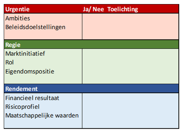 Bovenaan staat het maatschappelijk of ruimtelijk belang. Als de gemeente haar ruimtelijke ambities of beleidsdoelstellingen met een ruimtelijk effect wil realiseren, wil zij een bepaalde mate van sturing en regie hebben op de ontwikkeling. Daarmee samenhangend wil de gemeente deze ambities en doelstellingen in een bepaalde periode verwezenlijken. Ze wil invloed op het tempo van de ruimtelijke ontwikkeling. Wil de gemeente versnelling, vertraging of afstemming in de diverse programma’s realiseren? De grondpositie van de gemeente speelt ook een rol. Heeft de gemeente al grond in bezit in het te ontwikkelen gebied? De positie van de markt zal ook geanalyseerd moeten worden. Hebben marktpartijen al grond in bezit in het te ontwikkelen gebied? Kan de markt de opgave realiseren binnen voor de gemeente acceptabele voorwaarden of is er bij een opgave sprake van marktfalen? Of vereist de opgave een rol voor de gemeente als ontwikkelkatalysator? De gemeentelijke organisatie mag niet vergeten worden. Heeft de gemeente voldoende capaciteit, expertise en deskundigheid beschikbaar? De financiële positie is tot slot ook een belangrijke factor. Is het risicoprofiel te overzien en zijn de financiële middelen aanwezig om deze risico’s op te vangen?