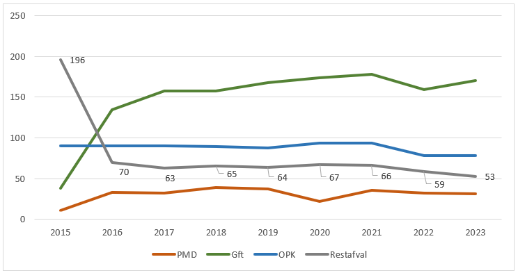 Figuur 1: Ontwikkeling restafval en grondstoffen per inwoner 2015-2023 (kg per inwoner)