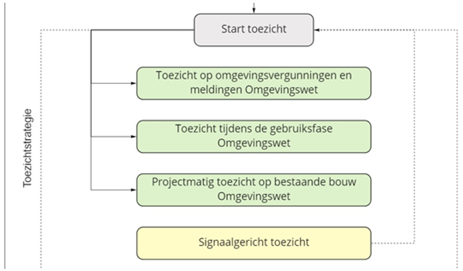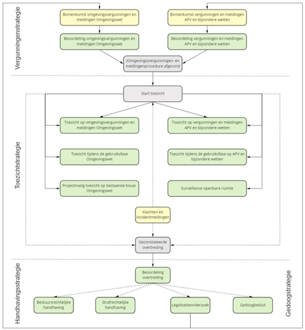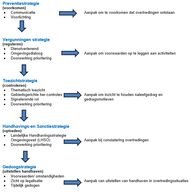 De werkwijze waarop wij de doelen stellen en prioritair werken willen bereiken is vastgelegd in de uitvoering-strategieën in de bijlagebundel. De strategieën zijn gebaseerd op landelijke strategieën (gedogen en sanctione-ren, Landelijke Handhavingsstrategie (LHS)) en zijn aangevuld met gemeentelijke strategieën. In de figuur hier-onder is de samenhang tussen de strategieën weergegeven. Ten opzichte van de vorige beleidsplannen zijn de strategieën drastisch herzien, mede door de inwerkingtreding van de Omgevingswet en Wkb. De komende be-leidsperiode gaan we de uitvoering van deze nieuwe strategieën monitoren en evalueren. Indien hiertoe aanlei-ding is, zullen de strategieën worden herzien. In hoofdstuk 1 t/m 4 van de Bijlagebundel zijn de strategieën na-der uitgewerkt.