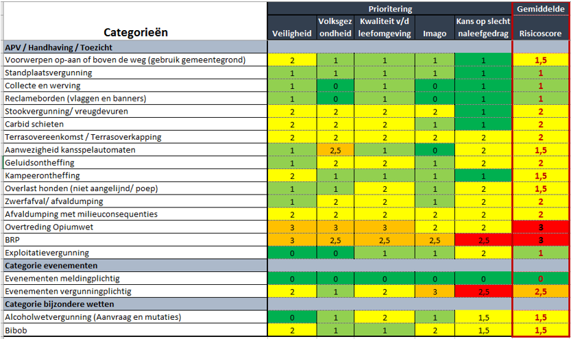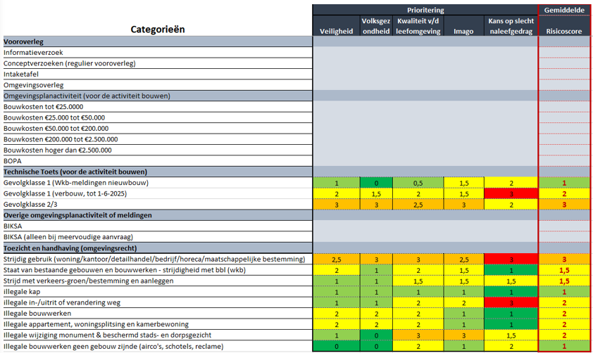 Om de medewerkers zo effectief mogelijk in te zetten, is bepaald welke activiteiten binnen de gemeente prioriteit hebben en welke minder. Deze afweging vindt plaats door toepassing van een risicomodel. Het model biedt de mogelijkheid om op basis van een risico-inschatting en prioritering de inzet te bepalen. Deze inschatting wordt gezamenlijk gemaakt en wordt vastgesteld door het college waarbij deze jaarlijks kan worden bijgesteld.