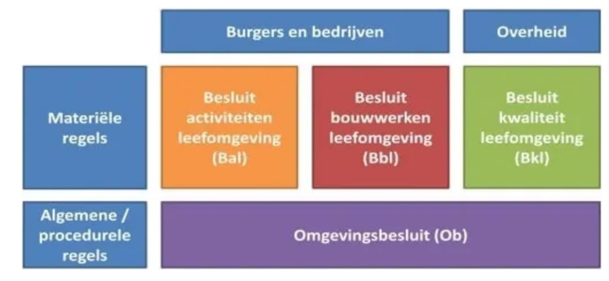Het Ob bevat regels voor alle partijen die actief zijn in de fysieke leefomgeving, zoals burgers, bedrijven en overheid. Het gaat om regels over het bevoegd gezag voor vergunningen, over procedures, handhaving en uitvoering. Het Ob bevat dus geen beoordelingscriteria voor vergunningverlening.