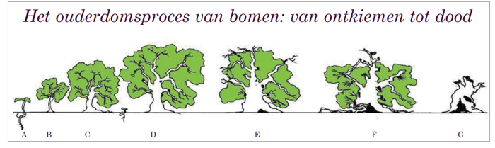 afb. 8: het verouderingsproces van bomen: meestal eindigt een boom al in fase of C. Als de boom ‘geluk’ heeft en heeft kunnen uitgroeien, wordt deze vaak omgezaagd of teruggesnoeid, vanwege mogelijke risico’s. Fase F en G worden vrijwel nooit bereikt