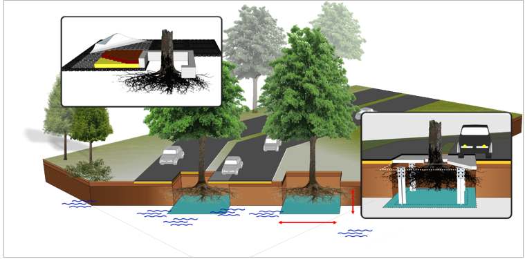 Het realiseren van groene parkeerplekken (open verharding) betekent vaak ook dat er meer ruimte is voor bomen. Als de parkeerplaatsen voldoende water en zuurstof doorlaten, kan de ruimte onder de fundering van de verharding worden gebruikt als groeiplaats voor de bomen.