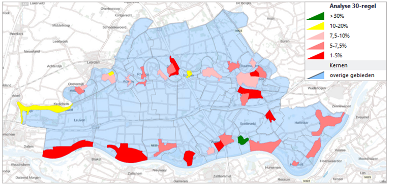 Voor het opstellen van het beleid is gebruik gemaakt van een analyse van de 3-30-300-regel. Er zijn kaarten waarop de kroonbedekking per kern is berekend. Aanvullend hebben we ook laten berekenen wat het aantal bomen is in de directe omgeving van alle woningen en wat de afstand is tot een hoogwaardige groene ruimte (bijvoorbeeld een park). Zie hiervoor bijvoorbeeld paragraaf 1.5.