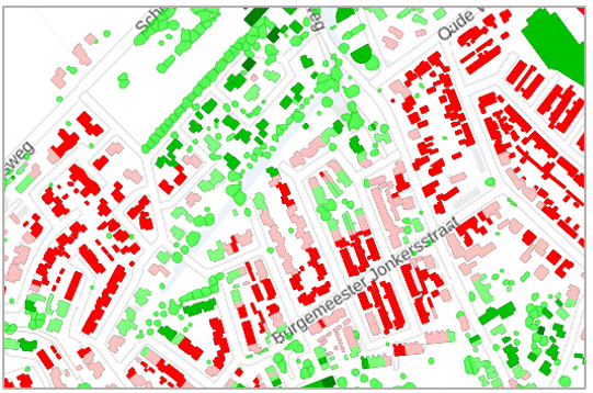afb. 18: hier is een gedeelte van de uitkomst van de analyse in Beesd te zien. Vanuit ‘groene’ gebouwen kunnen meer dan 3 bomen worden gezien, vanuit de rode niet