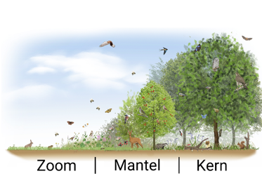 afb. 20: binnen een goede boomstructuur is sprake van een kern (grote volgroeide bomen), mantel (struikgewas en kleine bomen) en zoom (bloemen en ruw gras).