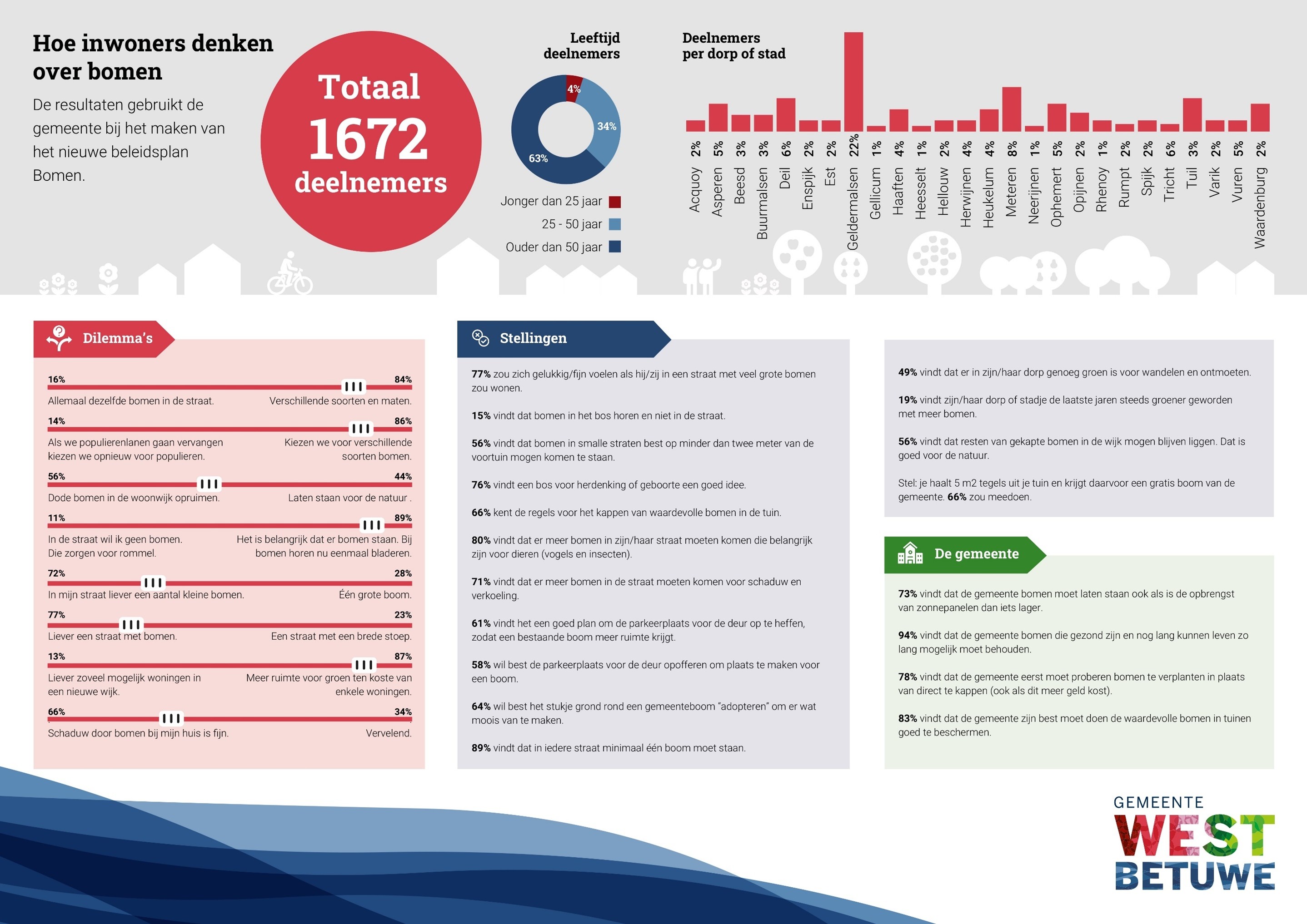Onze bewoners hebben via een ‘flitspeiling’ met eenvoudige vragen en stellingen hun mening over bomen gegeven. In totaal deden maar liefst 1672(!) bewoners mee, verdeeld over de kernen van de gemeente. Dit is ruim 3% van de bewoners van de gemeente. De resultaten zijn ook nadrukkelijk meegenomen bij het opstellen van het Programma Bomen. De resultaten van de peiling zijn opgenomen op een poster in bijlage 3. Kort samengevat was de reactie als volgt: