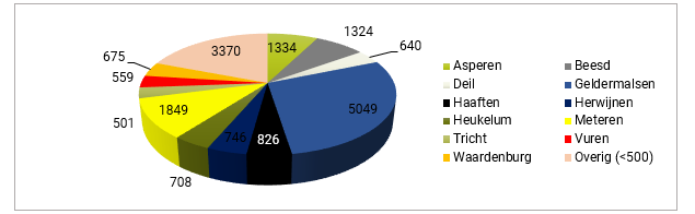 Zo’n 20.000 bomen staan buiten de bebouwde kom. Op onderstaande afbeelding is zichtbaar hoe overige 18.000 bomen zijn verdeeld over onze grootste kernen. Daarin valt op dat in de grootste kern Geldermalsen ook verreweg de meeste bomen staan.