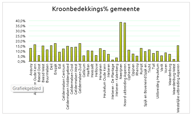 In onderstaande grafiek is de kroonbedekking per kern weergegeven. Het betreft hier het percentage kroonbedekking op gemeentelijk eigendom.