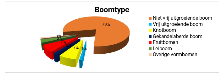 Het beheer van onze bomen is vooral afhankelijk van het type boom. We hebben vooral niet vrij uitgroeiende bomen. Deze staan langs wegen en paden en worden in hun jeugdfase opgekroond vanwege de doorrijhoogte. Vrij uitgroeiende bomen hebben alle ruimte om vrij uit te groeien en worden in principe niet gesnoeid. Daarnaast hebben we allerlei soorten vormbomen in onze gemeente. Deze bomen worden door snoei in een bepaalde vorm gehouden. De grootste groepen zijn de knotbomen en hoogstamfruitbomen.