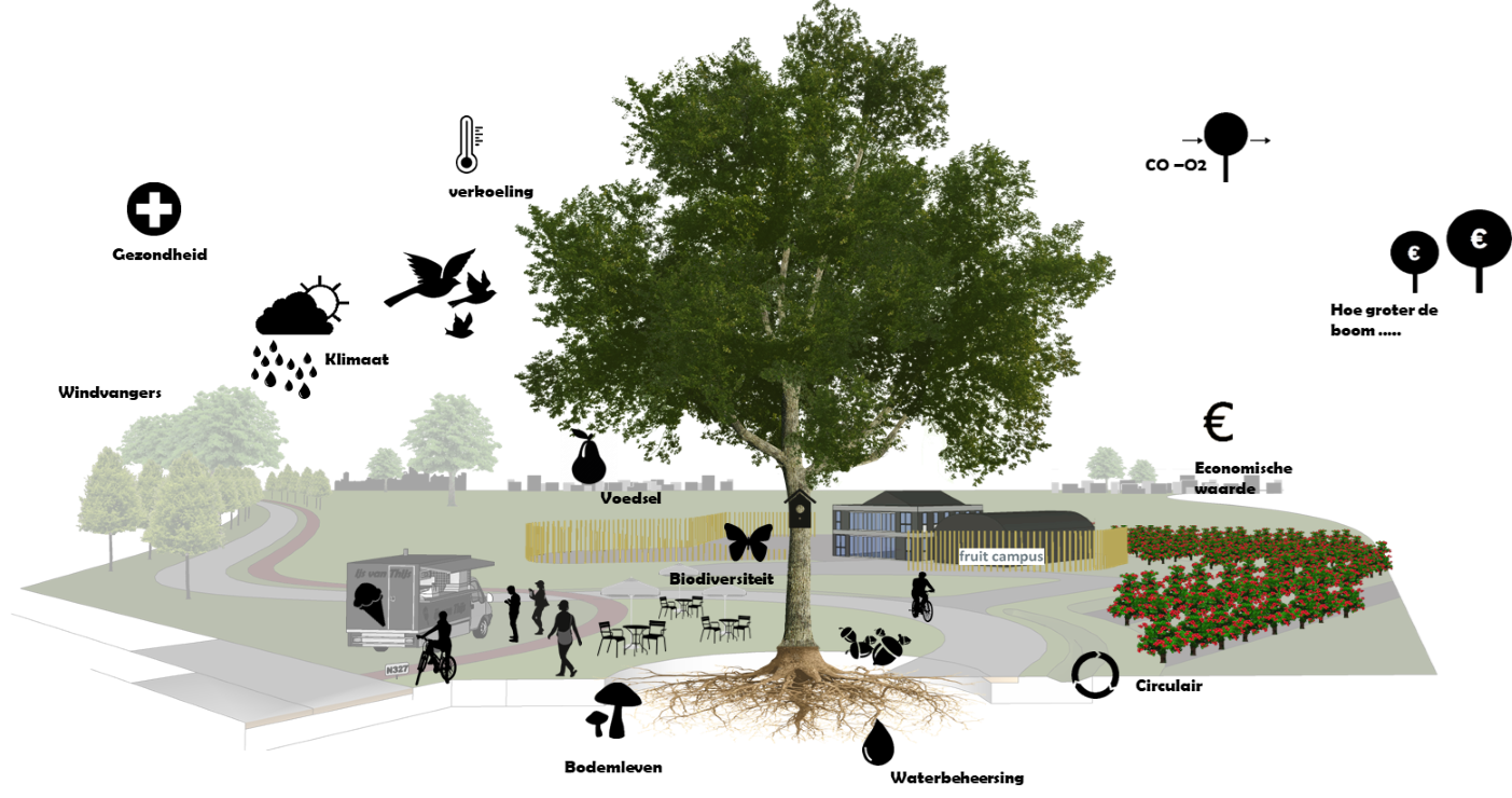 Bomen zijn belangrijk. Ze bieden ons diensten op tal van vlakken, dit noemen we ecosysteemdiensten. In onderstaande plaat zien we veel van deze waarden terugkomen. Sommige waarden kunnen we als mensen direct gebruiken of toepassen, zoals het eten van vruchten, of de waarde van hout. Andere waarden zijn meer indirect van waarde, zoals de schaduw die een boom biedt, of het afvangen van regenwater, zodat ons riool minder zwaar wordt belast.