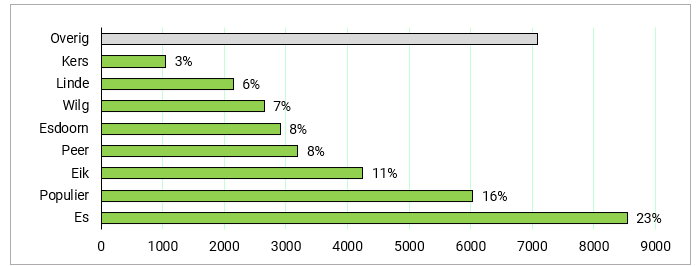 In onderstaande diagram hebben we onze boomsoorten samengevat per geslacht. Daarin valt vooral op dat we veel essen en populieren hebben. Deze essen zijn vatbaar voor de essentaksterfte (boomziekte). Ook het grote aandeel (Canadese) populieren is een risico, omdat deze meestal niet zo oud worden en op latere leeftijd last krijgen van takbreuk.