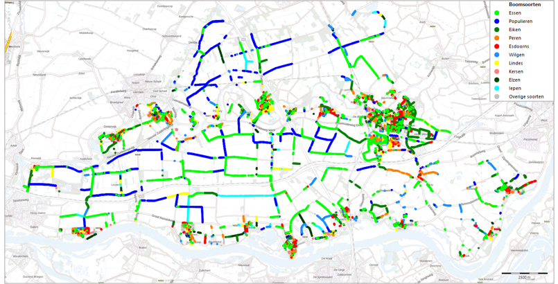 Op de kaart is te zien dat de diversiteit in soorten met name in het buitengebied laag is. In het buitengebied staan vooral lange rijen met populieren en essen. Ook de eiken staan vaak in lange rijen, maar wel vaker in of rondom de kernen. Binnen onze kernen is de diversiteit aanzienlijk hoger.