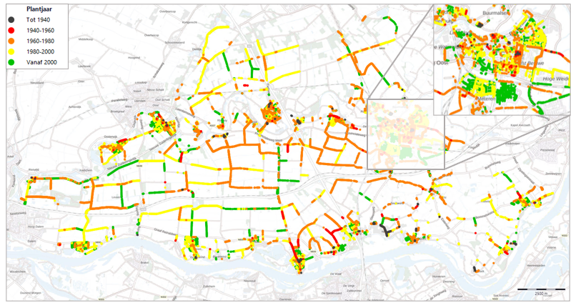 Het grootste deel van onze bomen is geplant vanaf de jaren ’70. Dit is vooral te danken aan de bouw van veel woningen in deze periode. In bijlage 5 zijn de plantjaren van de bomen op kaart weergegeven. Daarbij is te zien dat de lanen in het buitengebied, maar ook diverse woonwijken in bijvoorbeeld Geldermalsen qua leeftijd erg eenzijdig zijn. Als hier ook nog eens weinig verschillende soorten staan, is dit een risico op een kaalslag in de toekomst.