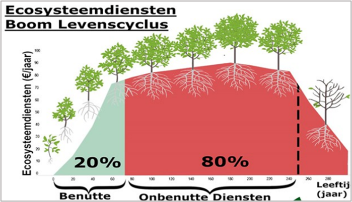 afb. 4: het verloop van de ecosysteemdiensten bij een boom, afgezet tegen de leeftijd.